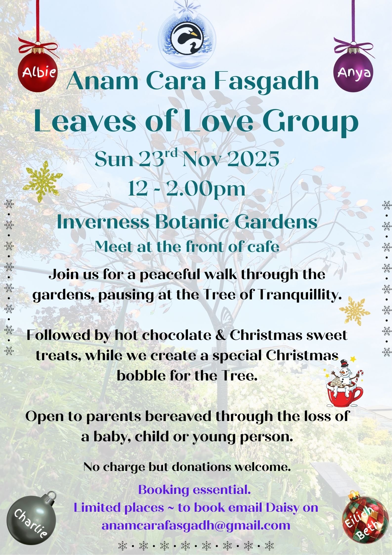 Families bereaved through the loss of a baby, child, or young person are warmly invited to join our Inverness Leaves of Love nature-based nurture group.